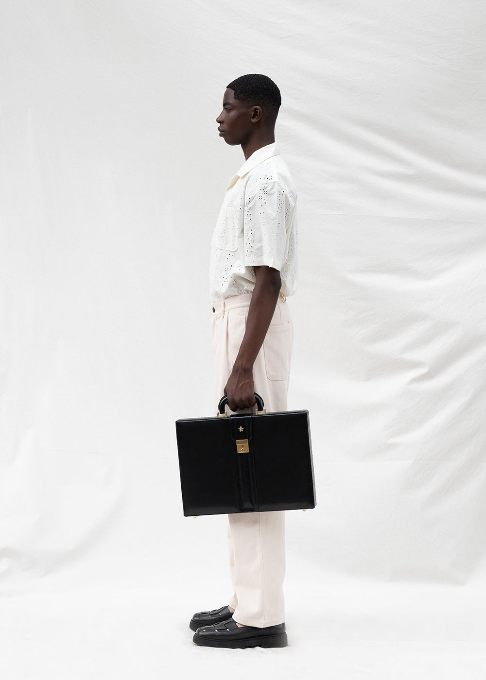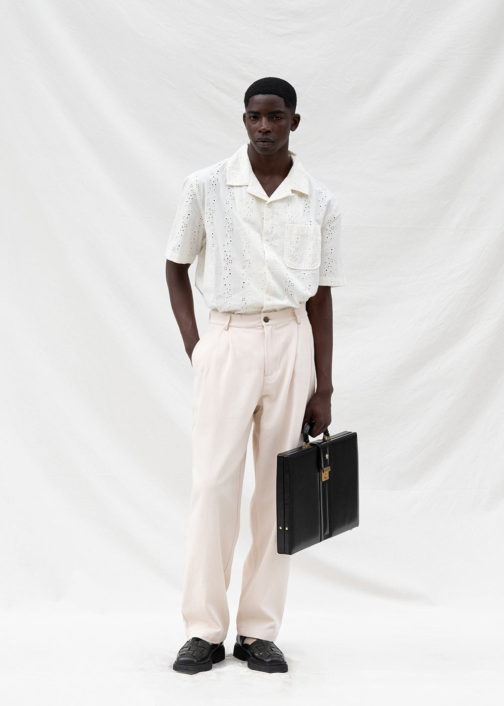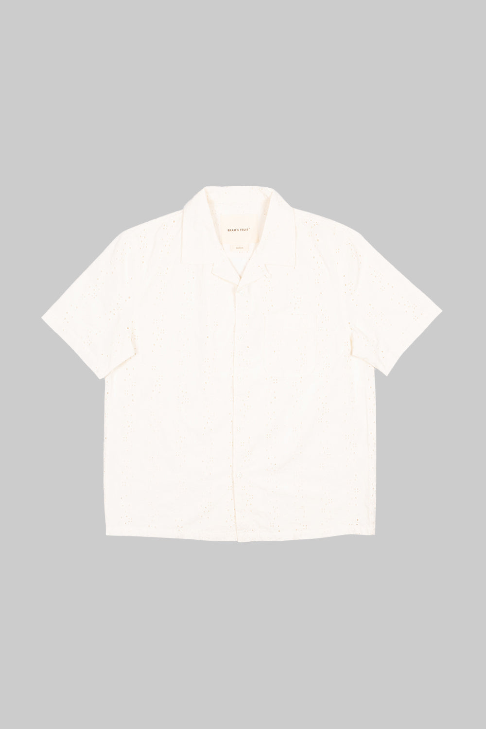 Our Broderie Shirt Shortsleeve in Off-White features embroidered flowers, with the Bram's Fruit name also stitched in Off-White.
