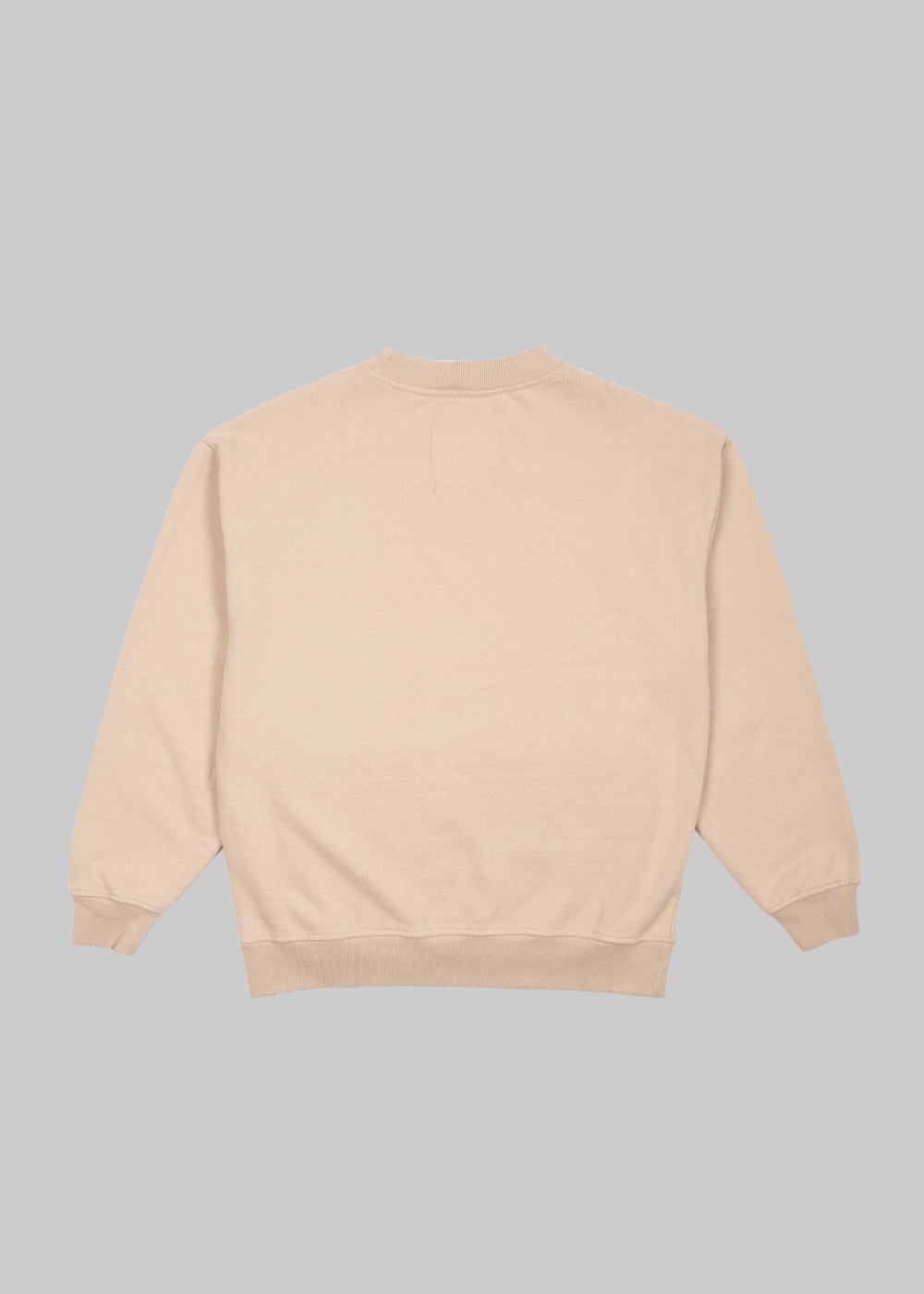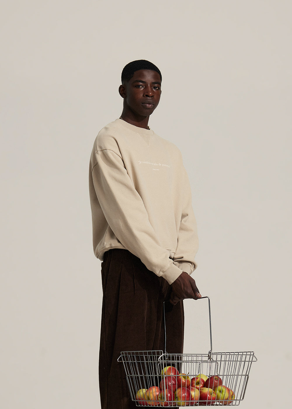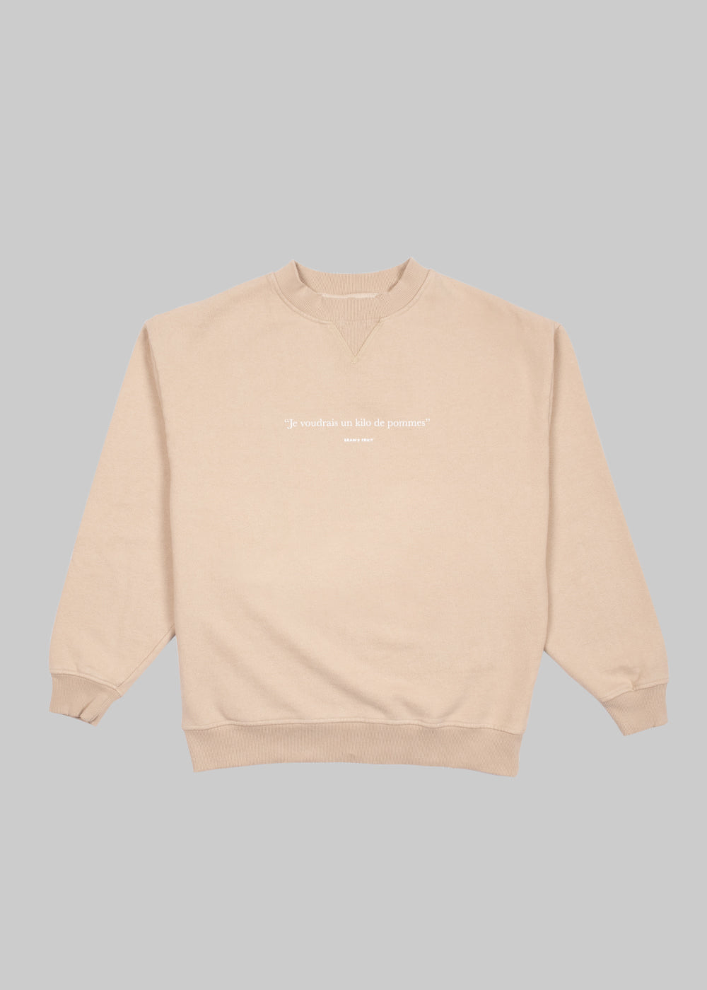 Our Distressed Crewneck in Beige features the phrase "Je voudrais un kilo de pommes" on the front.