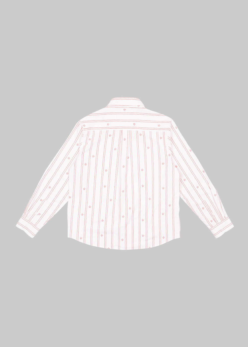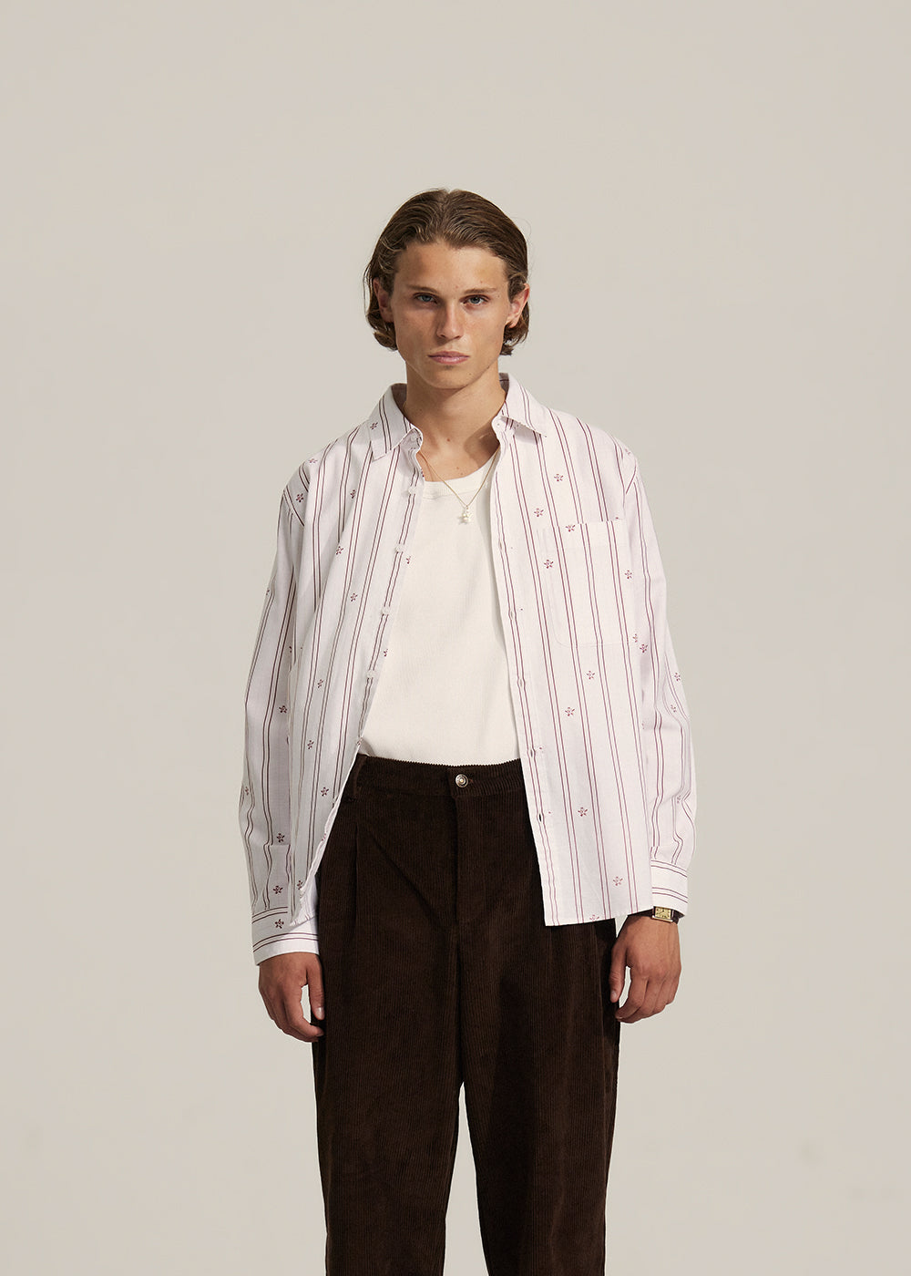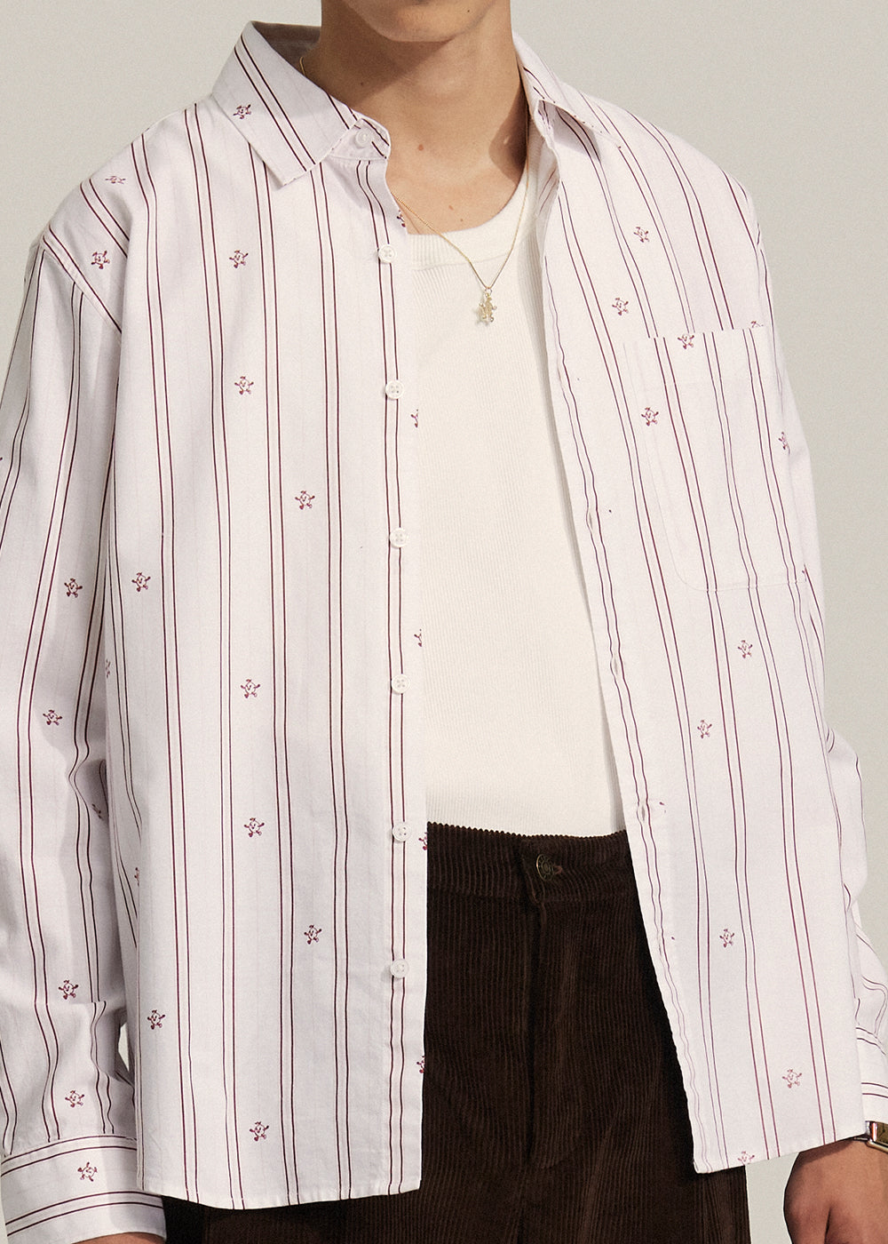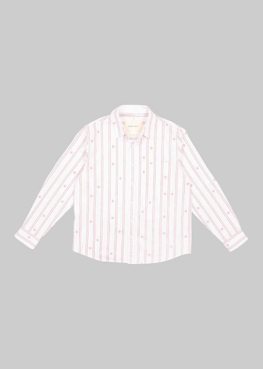 Our Lemon Pattern Shirt in Red features our logo elegantly printed into a striped pattern.