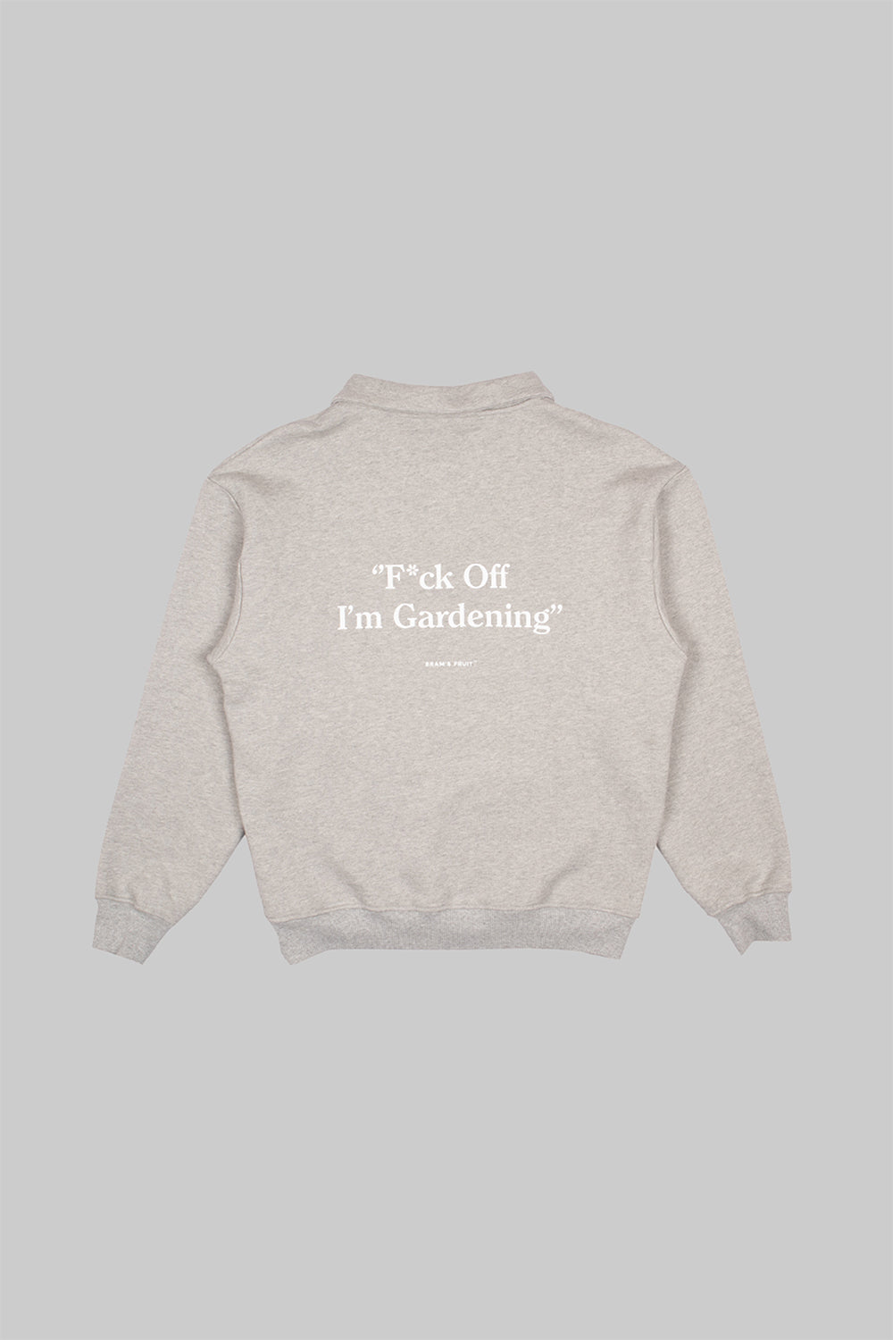 Our Polo Sweat in Light Grey features the slogan "F*ck off I'm Gardening" in White on the back.